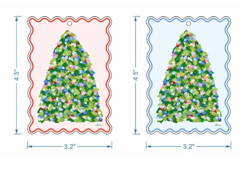 An Emily Nichols confetti Christmas tree in ornament form! These joyful ornaments come in two different color ways, pink with red border and shades of blue with the cutest scallop border. Add to your own ornament collection or gift to a friend!